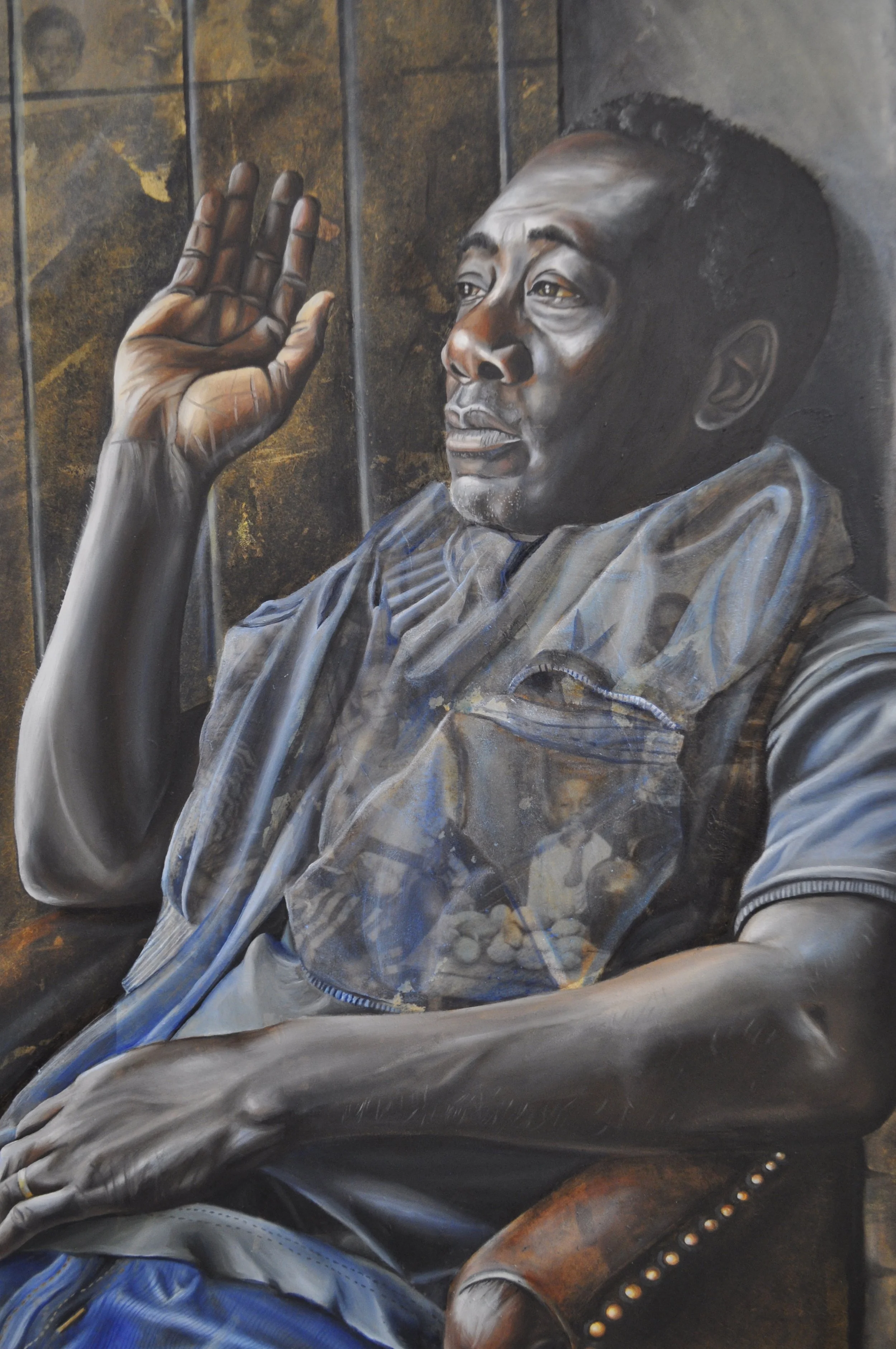 Donkor approaches portraiture as a collaborative exercise between him and his sitters. He works with the subjects of his paintings to identify objects and images that convey their personal narrative, including family photos, fabrics and personal belongings.
